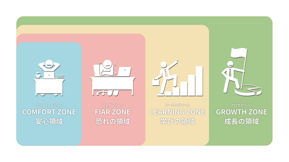 普段通りに過ごしている安心できる領域です。この領域にいるとストレスは少なく、何かに挑戦するための勇気を振り絞る必要もないのでとても居心地が良く感じます。